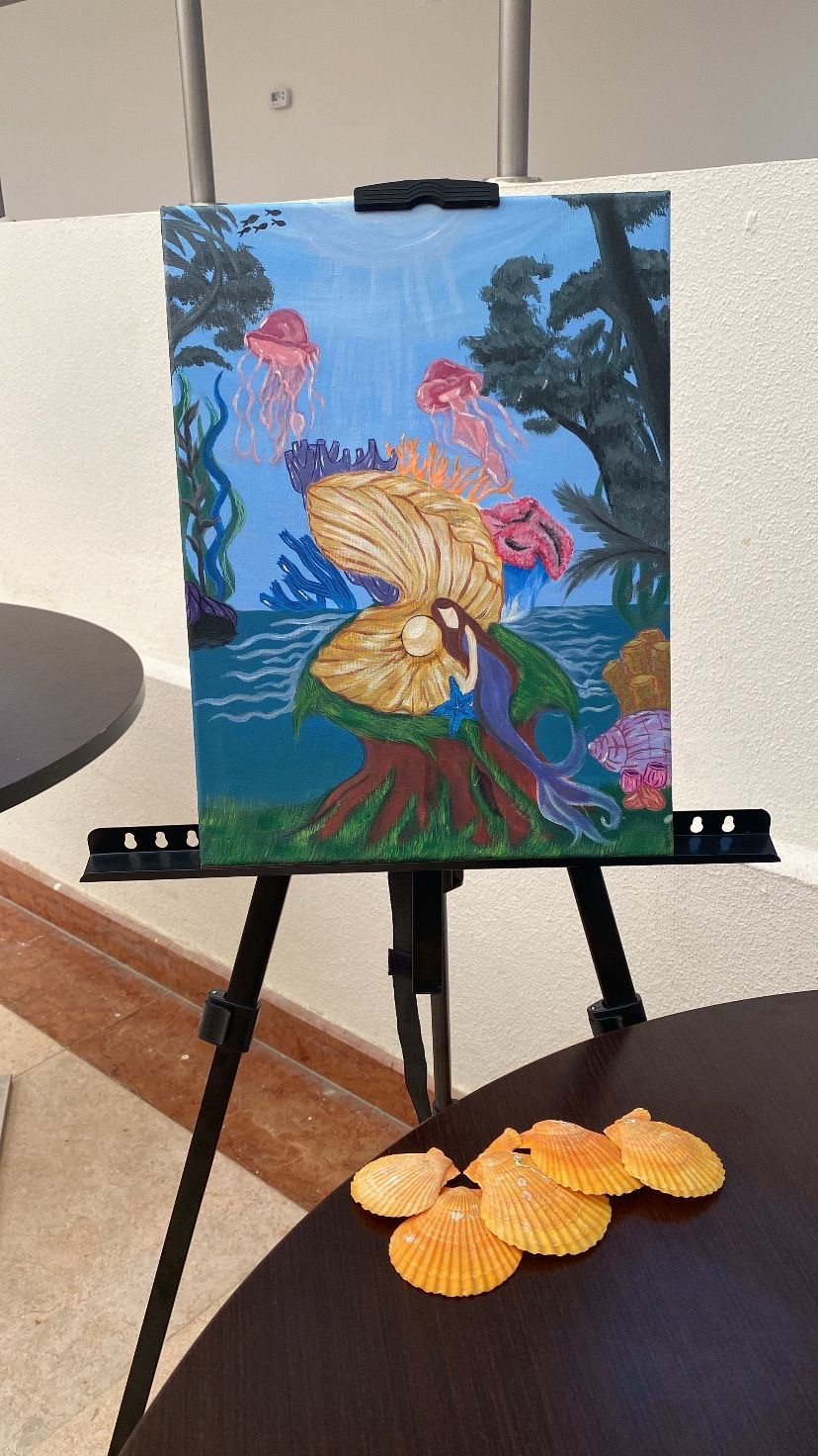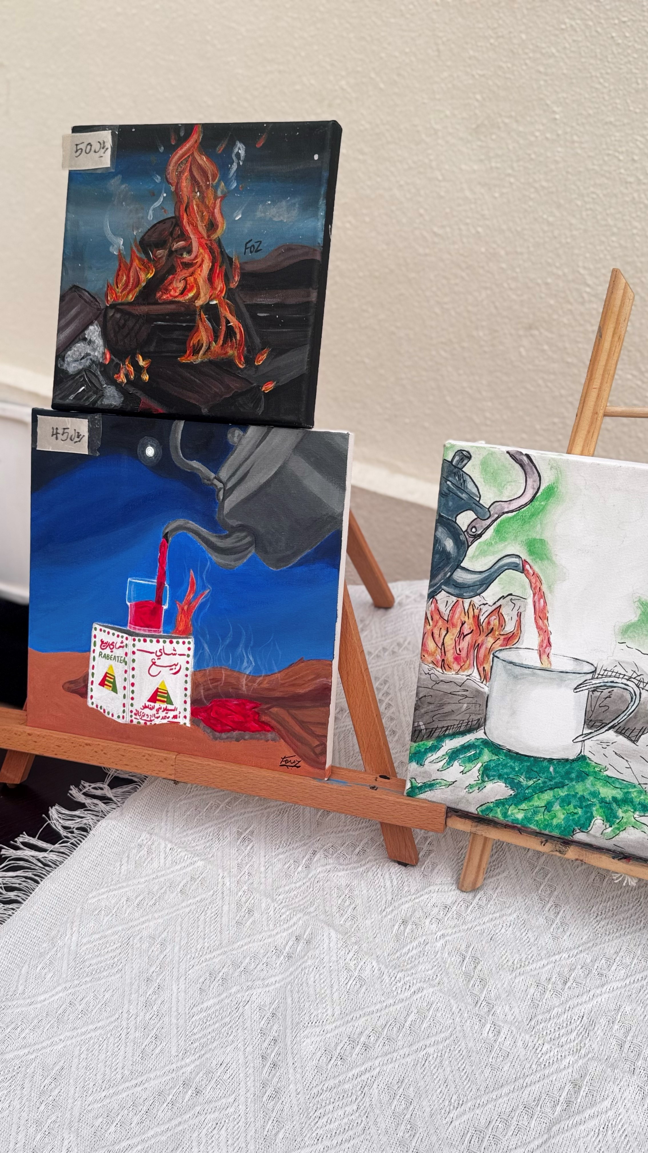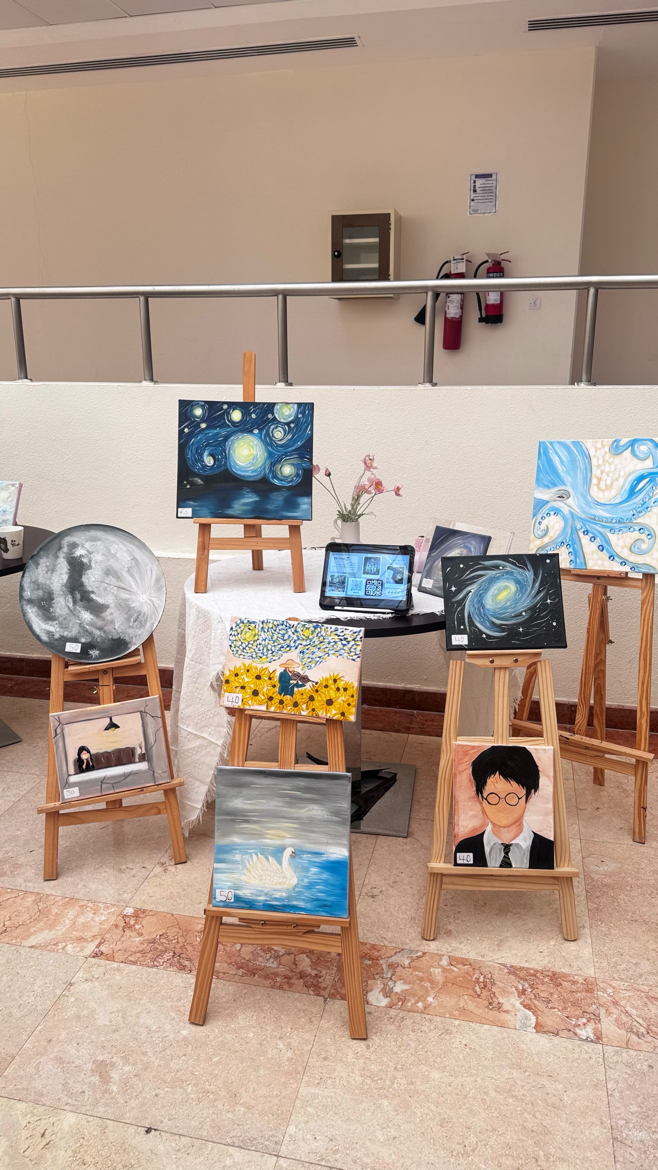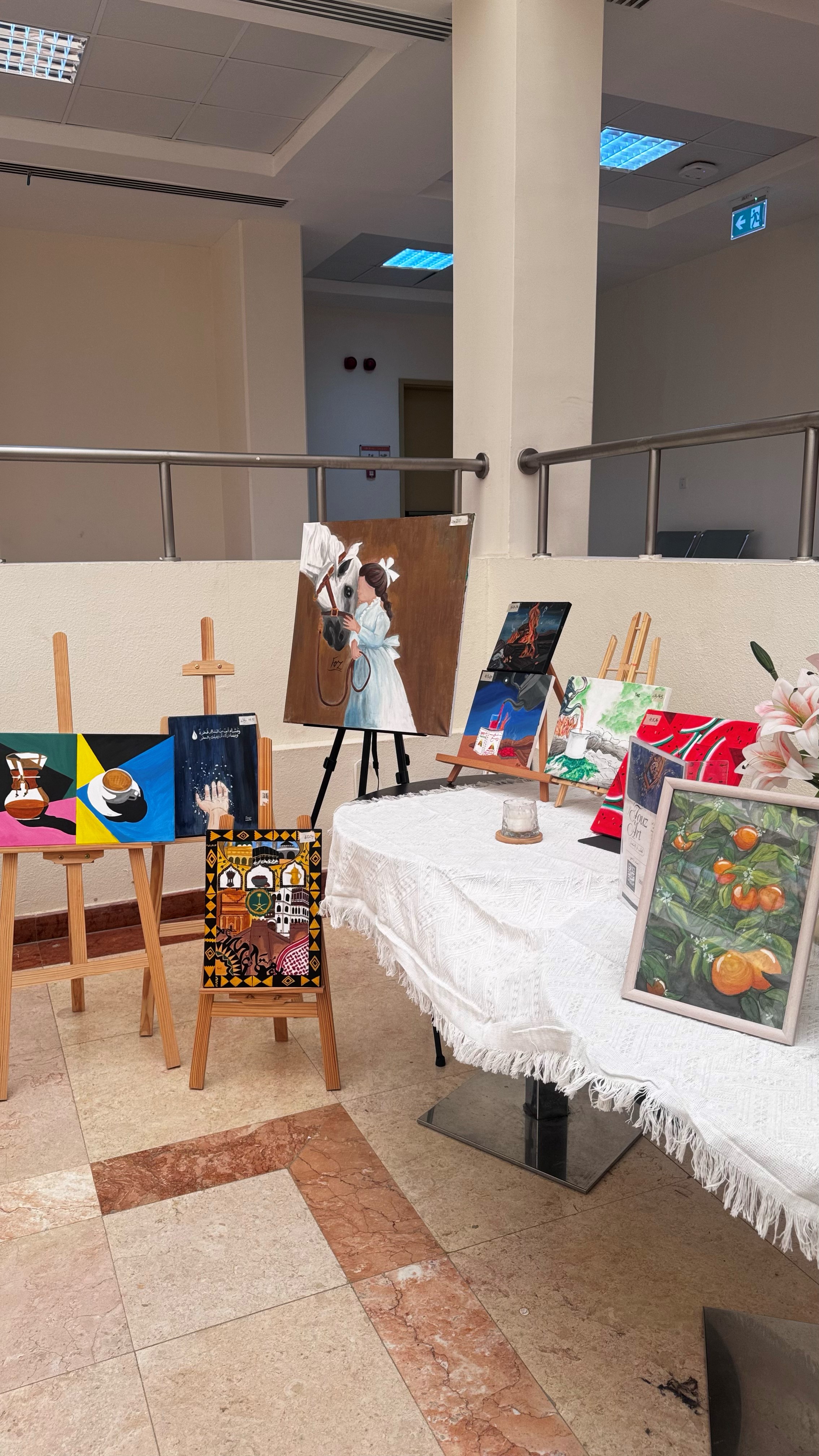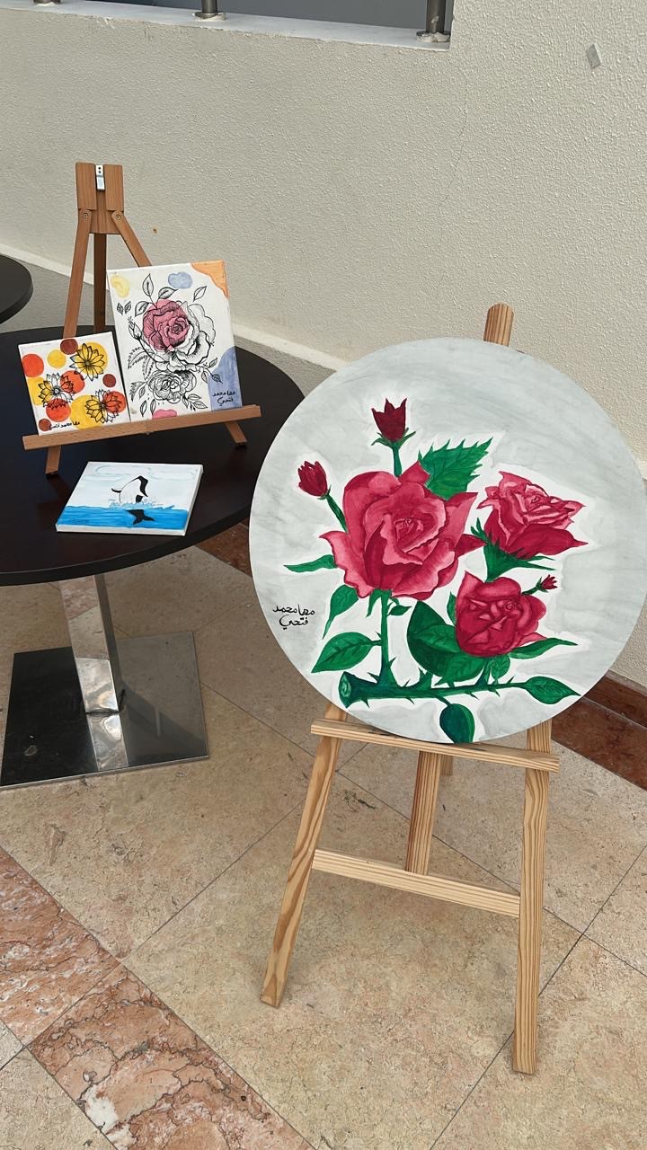 • مرسم حيّ، حيث قامت الطالبات برسم لوحات مباشرة أمام الجمهور.